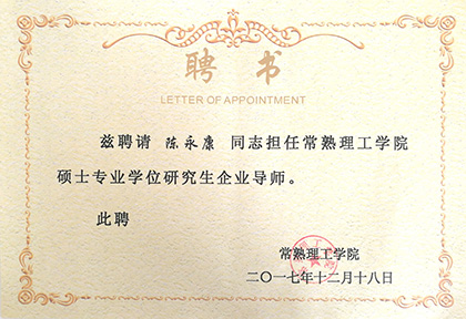 祝賀公司董事長陳永康先生被聘請為常熟理工學院碩士專業(yè)學位研究生企業(yè)導師